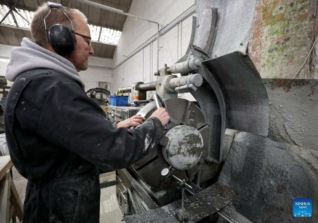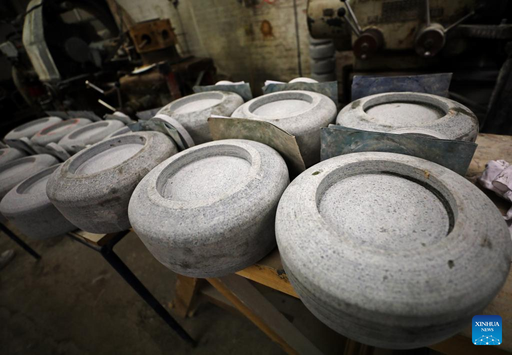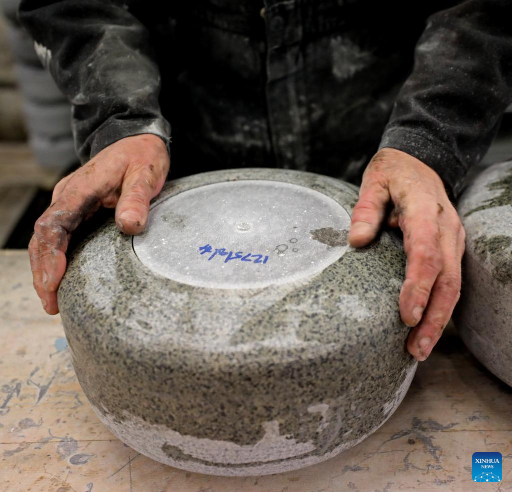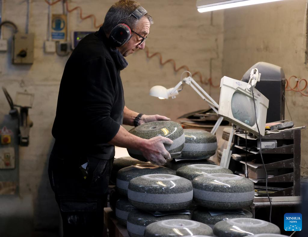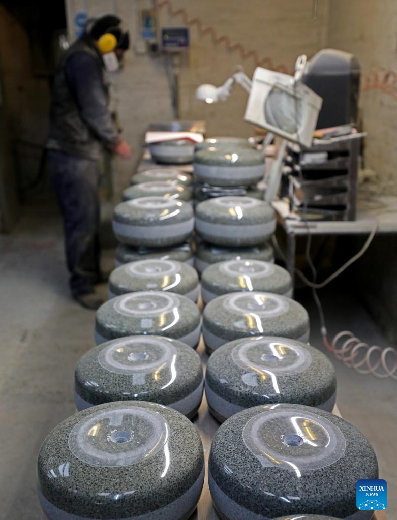 A man works in Kays Curling factory in Mauchline, Scotland, Britain, Jan. 24, 2022. Every single Olympic curling stone is made of granite from a little island off the west coast of Scotland, called Ailsa Craig. The Ailsa Craig granite is some of the hardest found in the world and maintains its shape despite grinding and wet conditions, making it perfect material for curling stone. All curling stones used at Olympic events are manufactured by Kays Curling in Mauchline, Scotland, Britain. (Xinhua/Li Ying)
