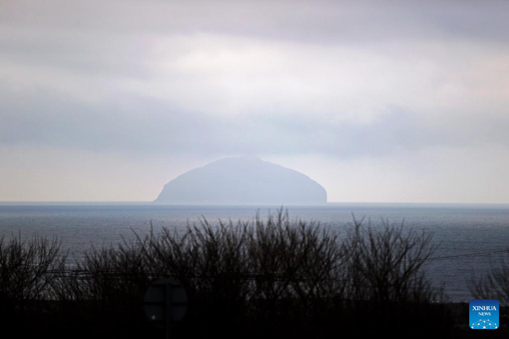 The island of Ailsa Craig is seen in the mist in Scotland, Britain, Jan. 24, 2022. Every single Olympic curling stone is made of granite from a little island off the west coast of Scotland, called Ailsa Craig. The Ailsa Craig granite is some of the hardest found in the world and maintains its shape despite grinding and wet conditions, making it perfect material for curling stone. All curling stones used at Olympic events are manufactured by Kays Curling in Mauchline, Scotland, Britain. (Xinhua/Li Ying)