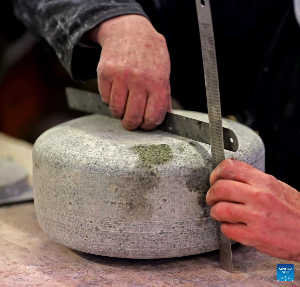 A man measures a curling stone in Kays Curling factory in Mauchline, Scotland, Britain, Jan. 24, 2022. Every single Olympic curling stone is made of granite from a little island off the west coast of Scotland, called Ailsa Craig. The Ailsa Craig granite is some of the hardest found in the world and maintains its shape despite grinding and wet conditions, making it perfect material for curling stone. All curling stones used at Olympic events are manufactured by Kays Curling in Mauchline, Scotland, Britain. (Xinhua/Li Ying)