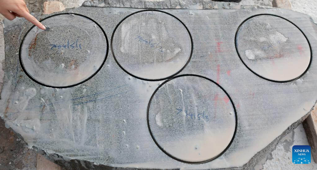 A piece of Ailsa Craig granite is seen after cutting in Kays Curling factory in Mauchline, Scotland, Britain, Jan. 24, 2022. Every single Olympic curling stone is made of granite from a little island off the west coast of Scotland, called Ailsa Craig. The Ailsa Craig granite is some of the hardest found in the world and maintains its shape despite grinding and wet conditions, making it perfect material for curling stone. All curling stones used at Olympic events are manufactured by Kays Curling in Mauchline, Scotland, Britain. (Xinhua/Li Ying)