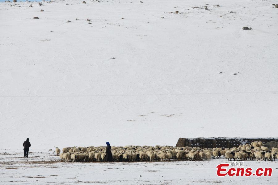 Herdsmen graze their sheep by Lake Namtso in southwest China's Tibet Autonomous Region, Jan. 26, 2022. Snow-covered Namtso is picturesque. (Photo/China News Service)
