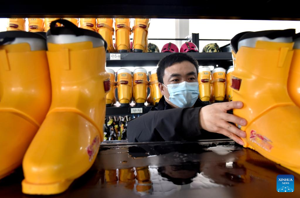 Yang Xubo arranges skiing boots at a ski resort in Xingtai, north China's Hebei Province, Jan. 27, 2022. Yang Xubo is a winter sports enthusiast in Xingtai. In 2018, he started a ski resort business. Yang believes that his 40000-square-meter ski resort will help promote winter sports among people. (Xinhua/Zhu Xudong)