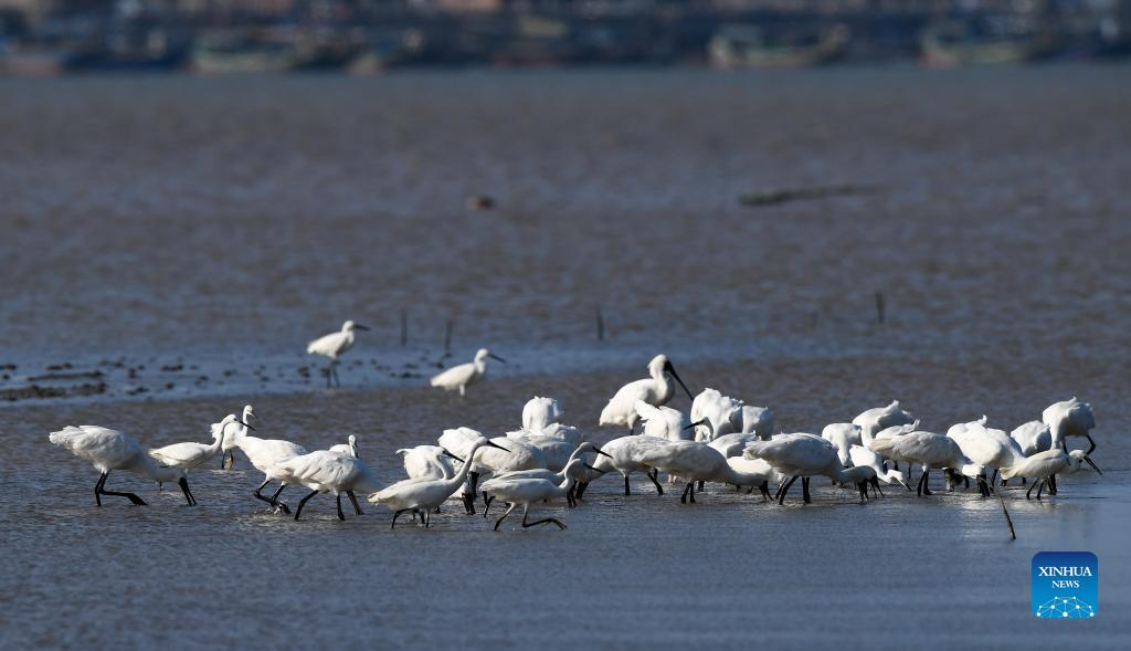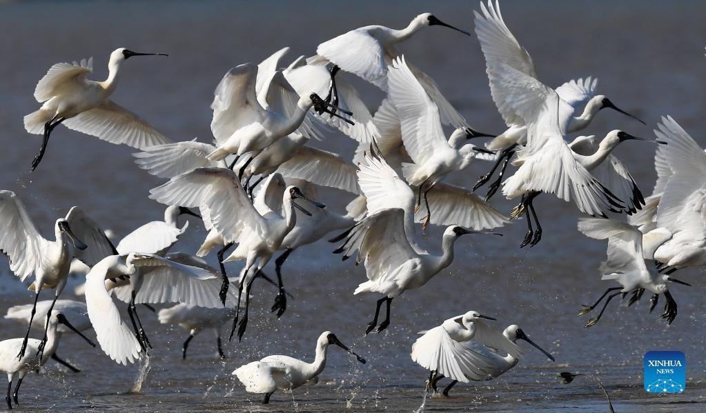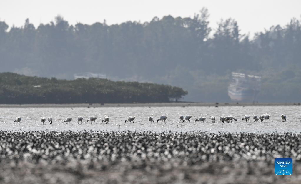 A flock of black-faced spoonbills and other birds are seen at a wetland park in south China's Hainan Province, Jan. 27, 2022. (Xinhua/Yang Guanyu)