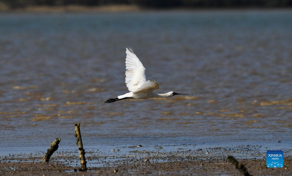 A black-faced spoonbill flies at a wetland park in south China's Hainan Province, Jan. 27, 2022. (Xinhua/Yang Guanyu)