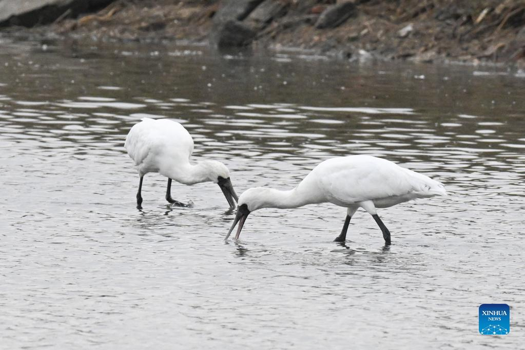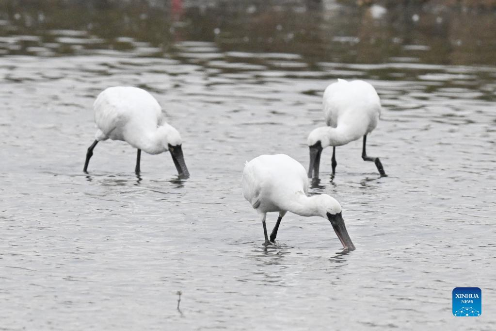 Black-faced spoonbills forage at a wetland in Danzhou, south China's Hainan Province, Jan. 24, 2022. (Xinhua/Pu Xiaoxu)