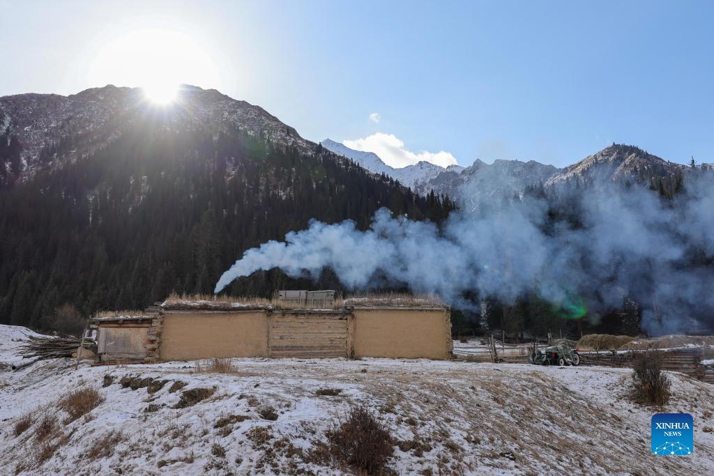 Photo taken on Jan. 26, 2022 shows a herdsmen's house in Akyaz Valley in Zhaosu County, Kazak Autonomous Prefecture of Ili, northwest China's Xinjiang Uygur Autonomous Region. Akyaz Valley is an important winter pasture for herdsmen in Zhaosu. Every year, herdsmen would migrate along the Akyaz River, driving over 500,000 cattle with them to settle in the valley for the winter. With an average altitude of 3,000 meters, the Akyaz Valley has abundant grass, water and a warmer climate, thanks to the surrounding mountains which block the cold winds. In recent years, while protecting the nomadic tradition, the local government has tried to improve the living conditions in the valley by upgrading the roads, building new communication facilities, installing photovoltaic generators for herdsmen's houses, and constructing animal husbandry hospitals. (Xinhua/Ding Lei)