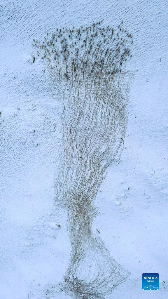 Aerial photo taken on Jan. 25, 2022 shows herdsmen herding sheep in Akyaz Valley in Zhaosu County, Kazak Autonomous Prefecture of Ili, northwest China's Xinjiang Uygur Autonomous Region. Akyaz Valley is an important winter pasture for herdsmen in Zhaosu. Every year, herdsmen would migrate along the Akyaz River, driving over 500,000 cattle with them to settle in the valley for the winter. With an average altitude of 3,000 meters, the Akyaz Valley has abundant grass, water and a warmer climate, thanks to the surrounding mountains which block the cold winds. In recent years, while protecting the nomadic tradition, the local government has tried to improve the living conditions in the valley by upgrading the roads, building new communication facilities, installing photovoltaic generators for herdsmen's houses, and constructing animal husbandry hospitals. (Xinhua/Ding Lei)