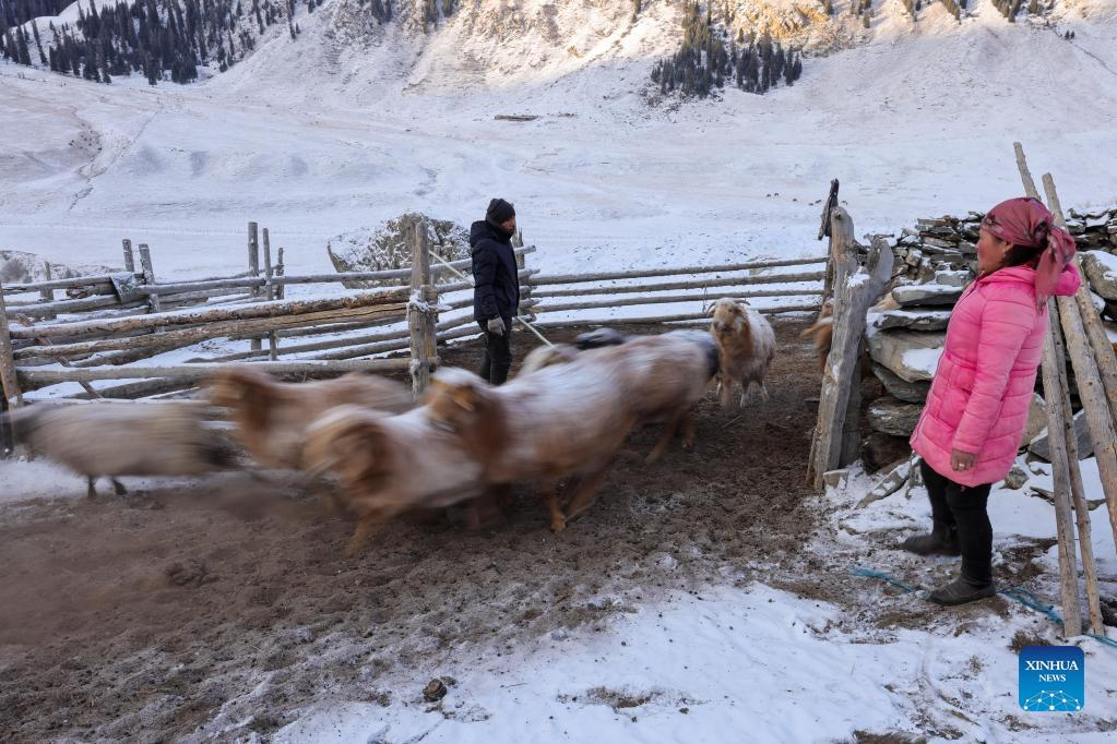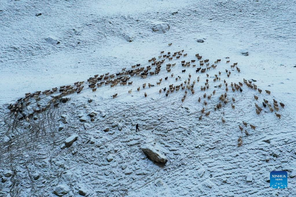 A herdsman herds sheep in Akyaz Valley in Zhaosu County, Kazak Autonomous Prefecture of Ili, northwest China's Xinjiang Uygur Autonomous Region, Jan. 25, 2022. Akyaz Valley is an important winter pasture for herdsmen in Zhaosu. Every year, herdsmen would migrate along the Akyaz River, driving over 500,000 cattle with them to settle in the valley for the winter. With an average altitude of 3,000 meters, the Akyaz Valley has abundant grass, water and a warmer climate, thanks to the surrounding mountains which block the cold winds. In recent years, while protecting the nomadic tradition, the local government has tried to improve the living conditions in the valley by upgrading the roads, building new communication facilities, installing photovoltaic generators for herdsmen's houses, and constructing animal husbandry hospitals. (Xinhua/Zhao Ge)