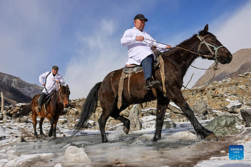 A herdsman rides on a horse in Akyaz Valley in Zhaosu County, Kazak Autonomous Prefecture of Ili, northwest China's Xinjiang Uygur Autonomous Region, Jan. 26, 2022. Akyaz Valley is an important winter pasture for herdsmen in Zhaosu. Every year, herdsmen would migrate along the Akyaz River, driving over 500,000 cattle with them to settle in the valley for the winter. With an average altitude of 3,000 meters, the Akyaz Valley has abundant grass, water and a warmer climate, thanks to the surrounding mountains which block the cold winds. In recent years, while protecting the nomadic tradition, the local government has tried to improve the living conditions in the valley by upgrading the roads, building new communication facilities, installing photovoltaic generators for herdsmen's houses, and constructing animal husbandry hospitals. (Xinhua/Li Zhihao)