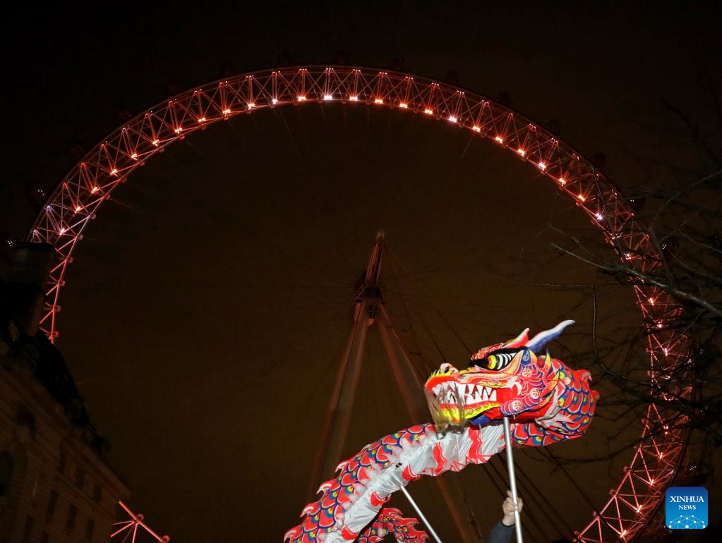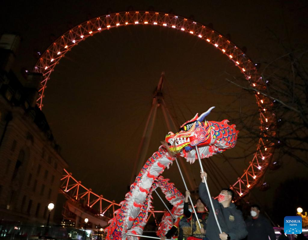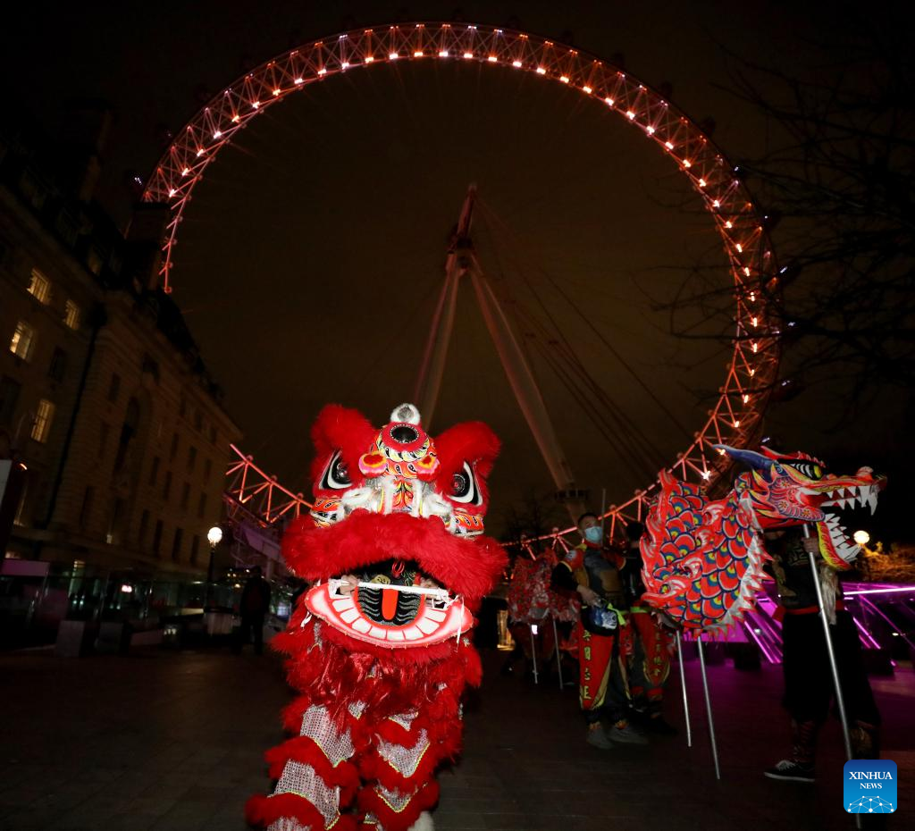 Traditional Chinese dragon dancers perform in front of the London Eye which is lit up in red to celebrate the upcoming Chinese New Year in London, Britain, on Jan. 28, 2022. (Xinhua/Li Ying)