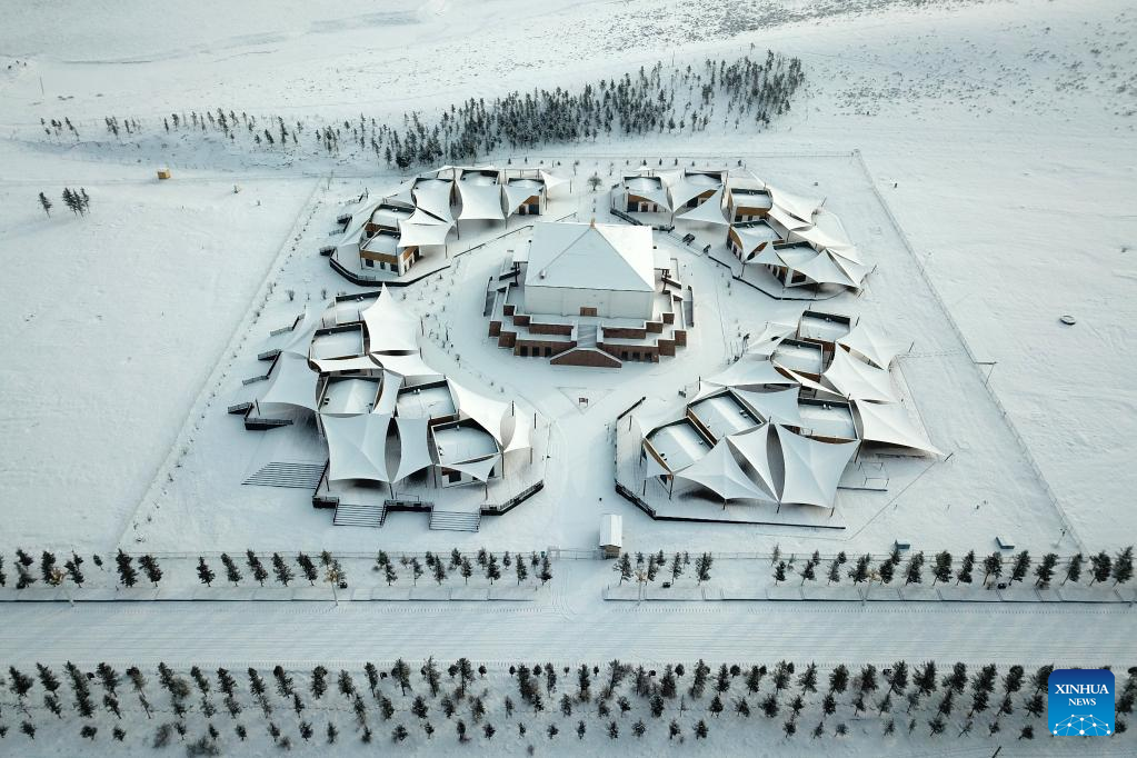 Aerial photo taken on Jan. 28, 2022 shows snow-covered tents in Hezuo City in Gannan Tibetan Autonomous Prefecture, northwest China's Gansu Province. (Xinhua/Fan Peishen)