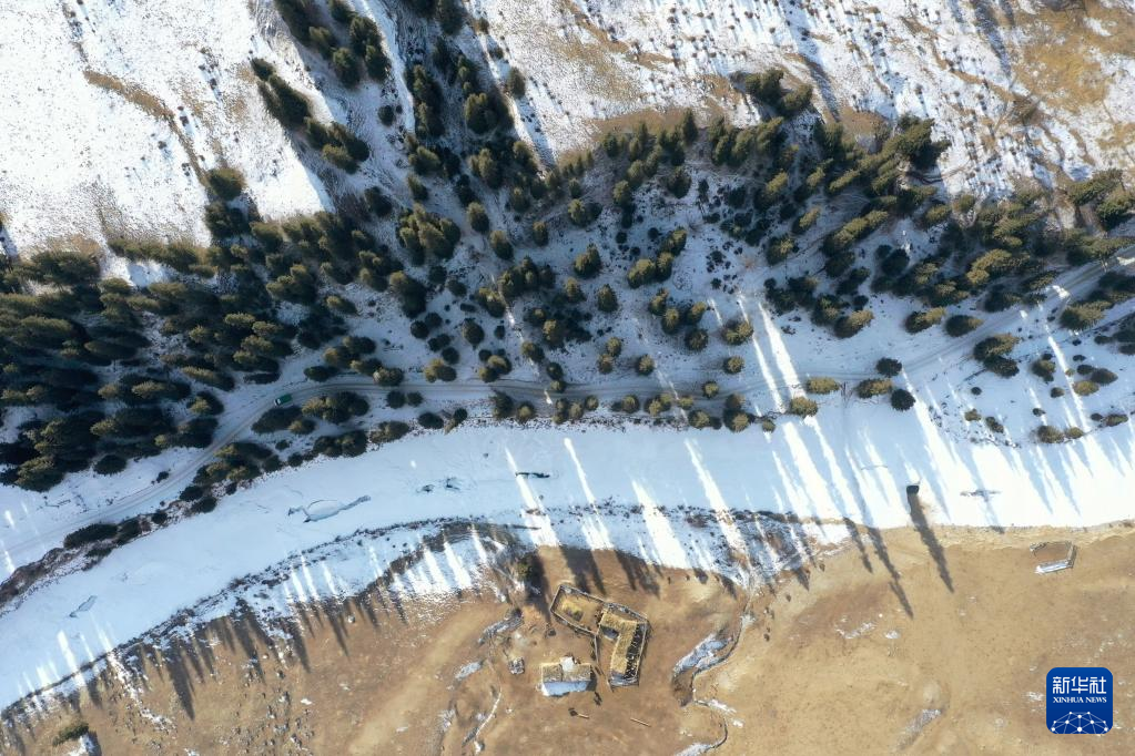 Aerial photo taken on Jan. 26, 2022 shows the scenery of Akyaz Valley in Zhaosu County, northwest China's Xinjiang Uygur Autonomous Region. Herdsmen in Xinjiang had lived a nomadic life for centuries. Under a housing project to benefit hundreds of households of local herdsmen, local authorities have initiated construction of supporting facilities to help herdsmen's settlement. It helps herdsmen to start a new life with better medical, educational, cultural and health facilities. (Xinhua/Li Zhihao)