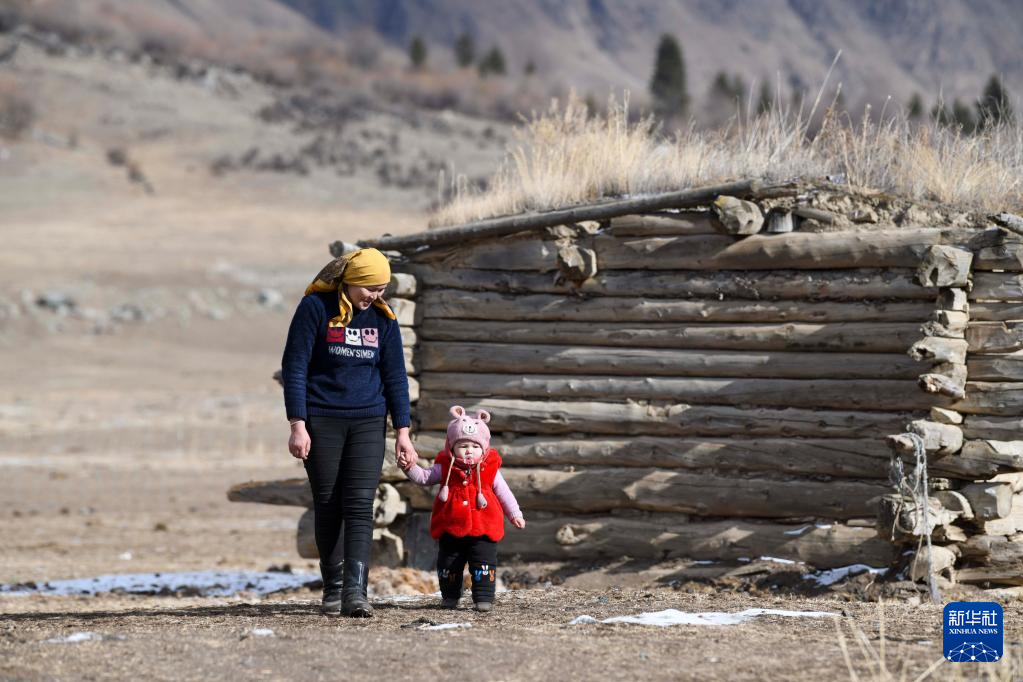 A woman and her child have fun at the Akyaz Valley in Zhaosu County, northwest China's Xinjiang Uygur Autonomous Region, Jan. 26, 2022. Herdsmen in Xinjiang had lived a nomadic life for centuries. Under a housing project to benefit hundreds of households of local herdsmen, local authorities have initiated construction of supporting facilities to help herdsmen's settlement. It helps herdsmen to start a new life with better medical, educational, cultural and health facilities. (Xinhua/Zhao Ge)