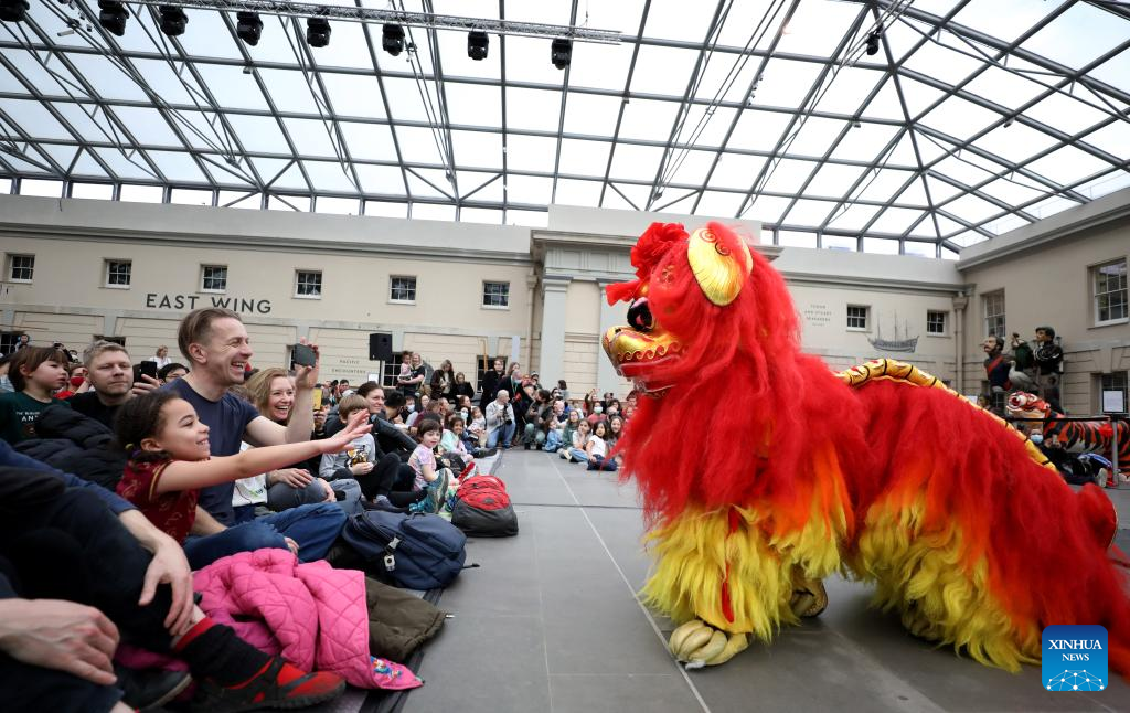People watch traditional Chinese lion dance performance during a Chinese Lunar New Year celebration held in National Maritime Museum in London, Britain, Jan. 29, 2022. (Xinhua/Li Ying)