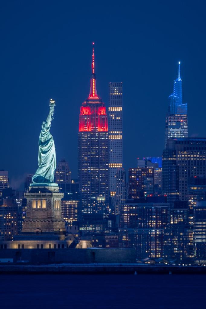 Photo taken on Jan. 30, 2022 shows the Empire State Building lit up in red for the Chinese Lunar New Year, in New York, the United States. (Photo by Winston Zhou/Xinhua)