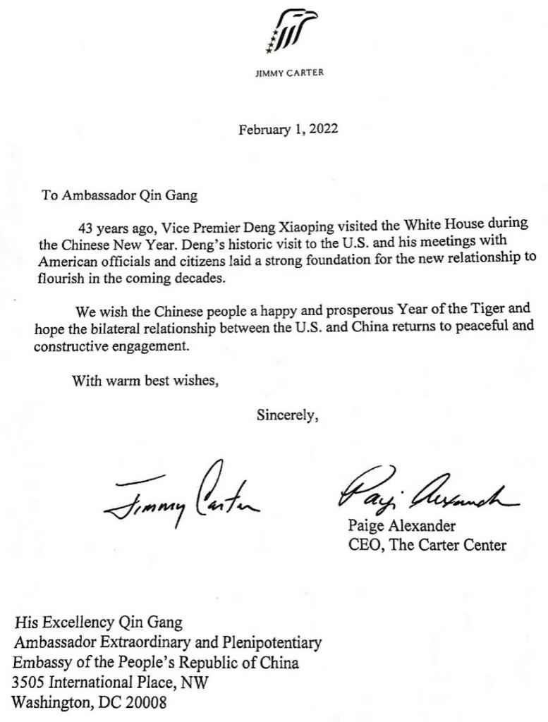 A photocopy of the congratulatory letter written by former U.S. President Jimmy Carter and Carter Center CEO Paige Alexander to Chinese Ambassador to the United States Qin Gang on the occasion of the Chinese New Year is posted on the website of the Chinese Embassy in the United States. (Xinhua)