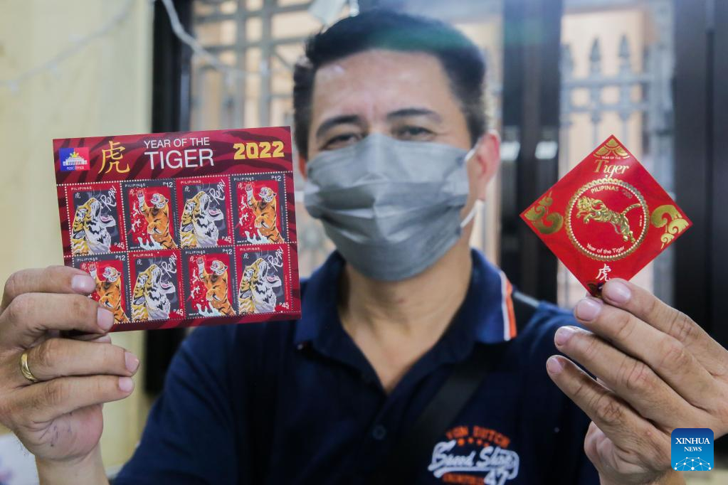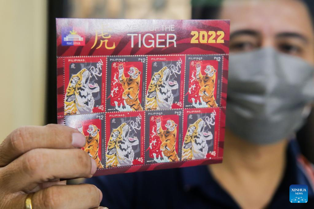 An employee of the Philippine Postal Corporation (PHLPost) holds the newly-launched commemorative "Year of the Tiger" special stamps in Manila, the Philippines, on Jan. 31, 2022. The PHLPost launched on Monday commemorative "Year of the Tiger" special stamps to celebrate the upcoming Chinese New Year. (Xinhua/Rouelle Umali)