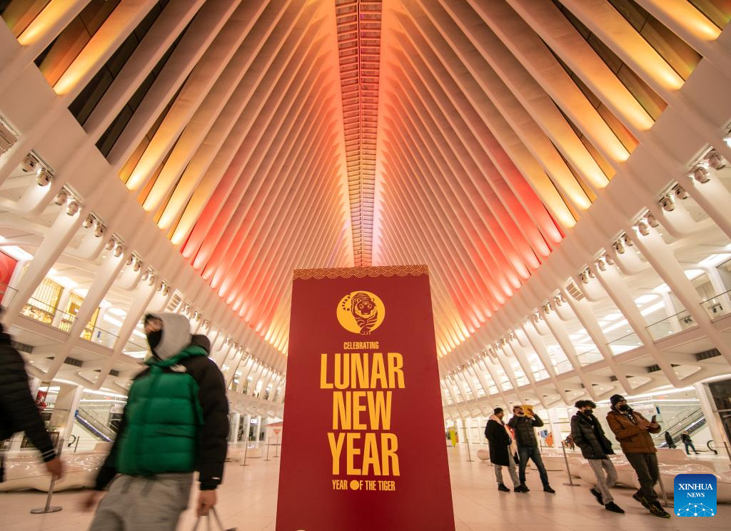Photo taken on Jan. 30, 2022 shows the Oculus illuminated for the Chinese Lunar New Year, in New York, the United States. (Photo by Winston Zhou/Xinhua)