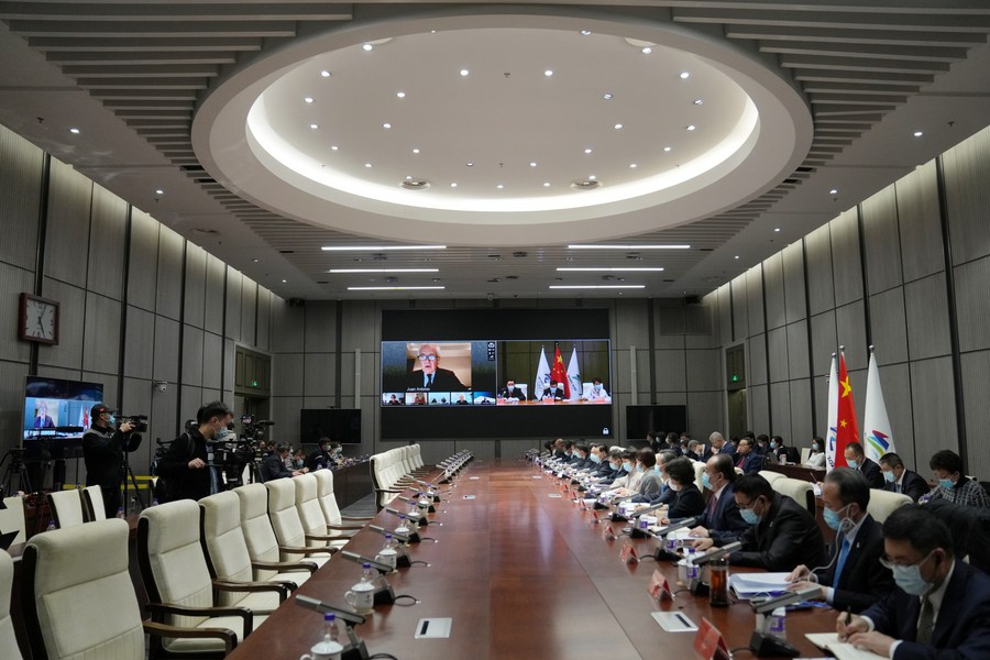 The 6th Meeting of the IOC Coordination Commission for the XXIV Olympic Winter Games Beijing 2022 is held in Beijing, capital of China, Nov. 2, 2021. (Xinhua/Ju Huanzong)