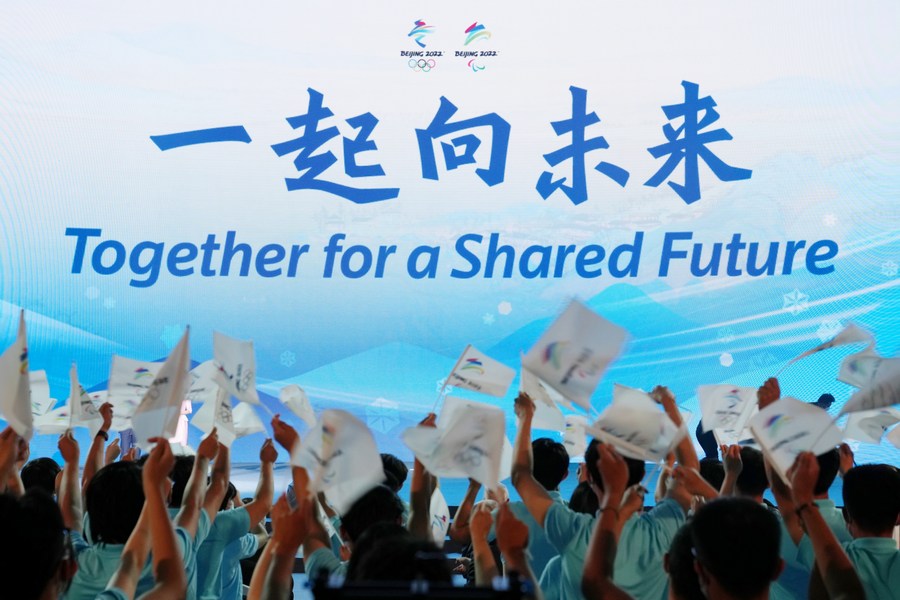 Photo taken on Sept. 17, 2021 shows the unveiling ceremony of the official motto for Beijing 2022 Winter Olympic and Paralympic Games "Together for a Shared Future" in Beijing, capital of China. (Xinhua/Ju Huanzong)