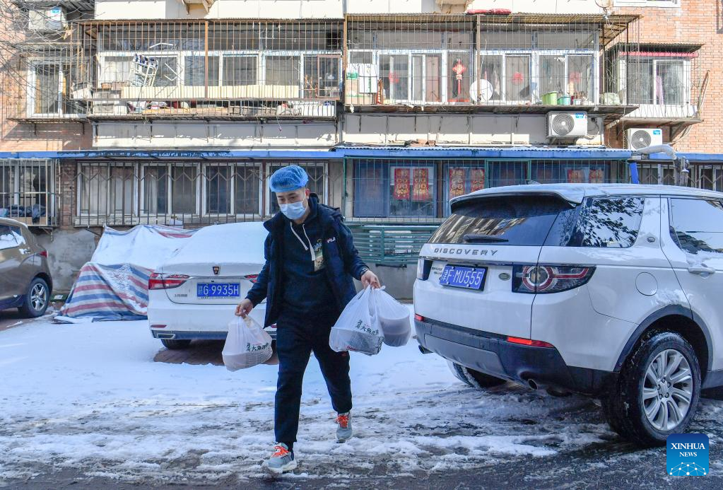A staff member of a restaurant delivers customers' pre-ordered meals at a residential area in Nankai District, north China's Tianjin, Jan. 31, 2022. In areas classified as low risk for COVID-19 in Tianjin, some restaurants have introduced takeout service for the holiday feasts. The service not only satisfies customers' demand but also can help to prevent the spread of COVID-19.
