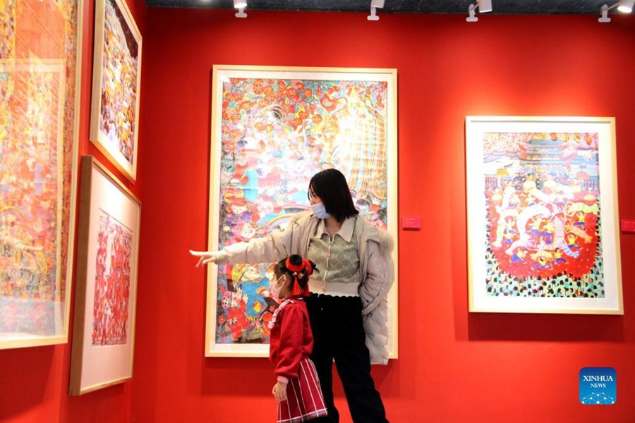 People visit an exhibition of New Year pictures in Xicheng District of Beijing, capital of China, Feb. 1, 2022. The exhibition kicked off here on Jan. 25, featuring more than 270 New Year pictures created to commemorate the arrival of the lunar new year in the Chinese tradition. (Xinhua/Tang Rufeng)
