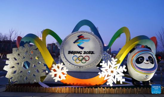 Photo taken on Jan. 29, 2022 shows the decorative installations with the theme of 2022 Beijing Winter Olympics at a square in Yanqing District of Beijing, capital of China. (Xinhua/Ren Chao)