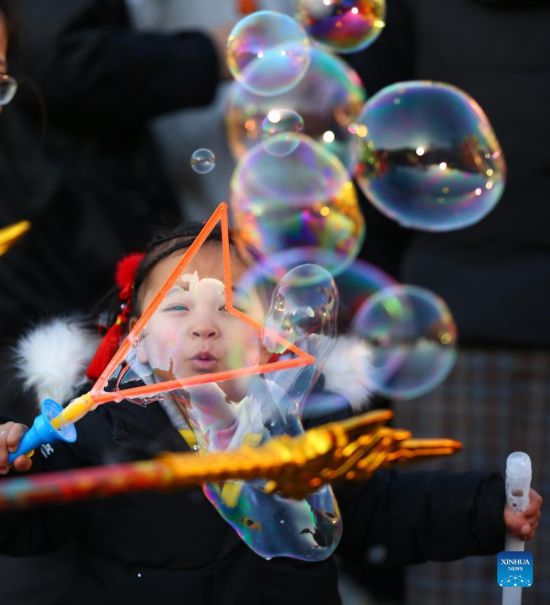 A girl blows bubbles at Jinghe Park in Tengzhou, east China's Shandong Province on Feb. 1, 2022. Various activities are held during the Spring Festival holidays. (Photo by Li Zhijun/Xinhua)