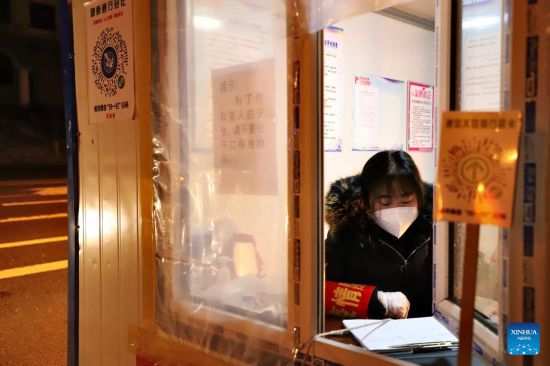 A volunteer is on duty in Suifenhe, northeast China's Heilongjiang Province, Jan. 31, 2022. To stem a new wave of COVID-19 resurgence, people from different walks in Suifenhe stick to their post and fight against the epidemic as the Spring Festival holiday approaches. (Xinhua/Xu Kaixin)