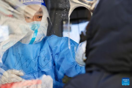 A medical worker takes a swab sample from a citizen for nucleic acid test at a testing site in Suifenhe, northeast China's Heilongjiang Province, Jan. 31, 2022. To stem a new wave of COVID-19 resurgence, people from different walks in Suifenhe stick to their post and fight against the epidemic as the Spring Festival holiday approaches. (Xinhua/Xu Kaixin)