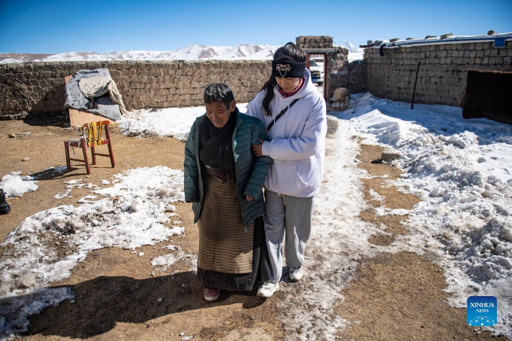 Tenzin Drolma (R) assists her grandmother into their house in Gyaga Village of Damxung County, southwest China's Tibet Autonomous Region, Jan. 18, 2022. Tenzin Drolma, 21, was born on the grassland near Lake Namtso in Tibet. In 2020, she was admitted to Jiangsu Food and Pharmaceutical Science College in east China's Jiangsu Province as a Chinese pharmacy major student. The college life in the outside world is fresh to Drolma. She met many new classmates and made many friends. When winter vacation came, Drolma returned to her beloved home. "I leave my hometown in order to come back being a better person," she said. "I hope that when I graduate from college, I can help my family live a better life and I can be a useful person to my hometown and people here." (Xinhua/Sun Ruibo)