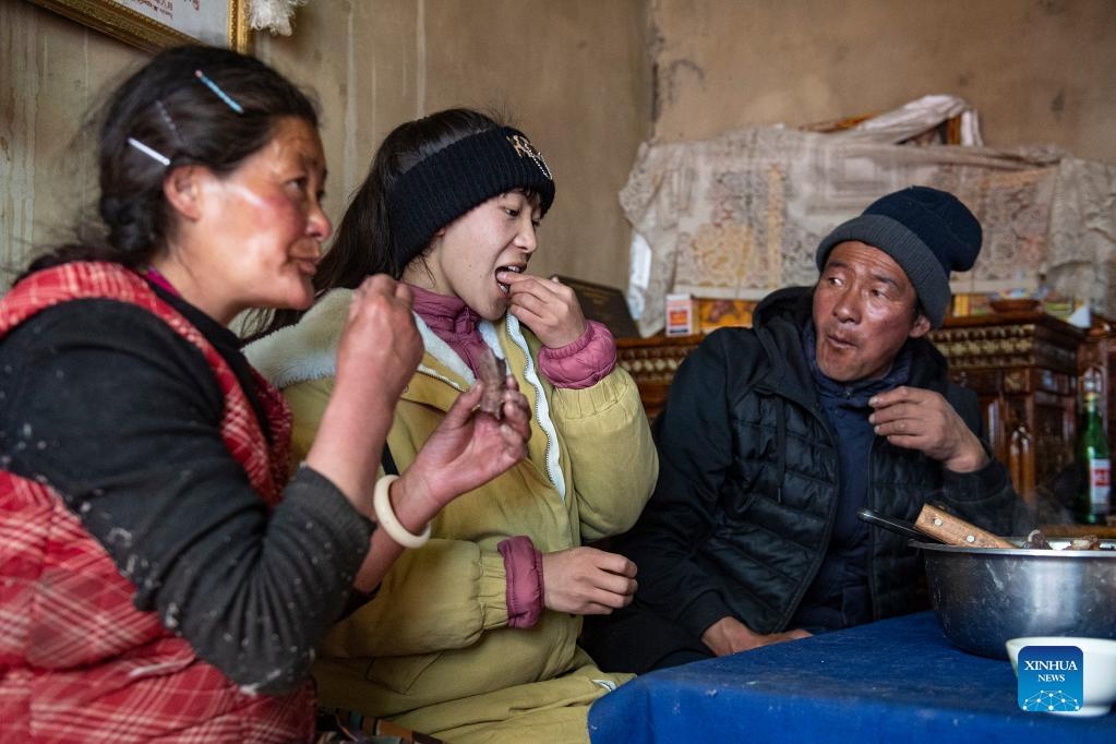 Tenzin Drolma (C) enjoys lunch with her parents in Gyaga Village of Damxung County, southwest China's Tibet Autonomous Region, Jan. 18, 2022. Tenzin Drolma, 21, was born on the grassland near Lake Namtso in Tibet. In 2020, she was admitted to Jiangsu Food and Pharmaceutical Science College in east China's Jiangsu Province as a Chinese pharmacy major student. The college life in the outside world is fresh to Drolma. She met many new classmates and made many friends. When winter vacation came, Drolma returned to her beloved home. "I leave my hometown in order to come back being a better person," she said. "I hope that when I graduate from college, I can help my family live a better life and I can be a useful person to my hometown and people here." (Xinhua/Sun Ruibo)