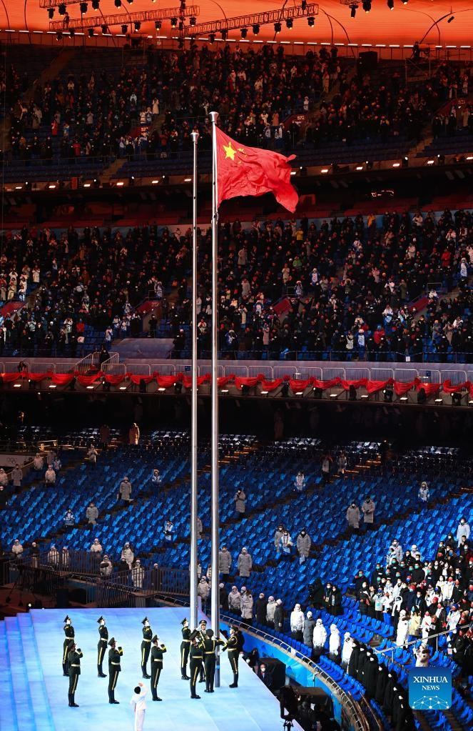 The Chinese national flag is raised during the opening ceremony of the Beijing 2022 Olympic Winter Games at the National Stadium in Beijing, capital of China, Feb. 4, 2022. (Xinhua/Li Ziheng)