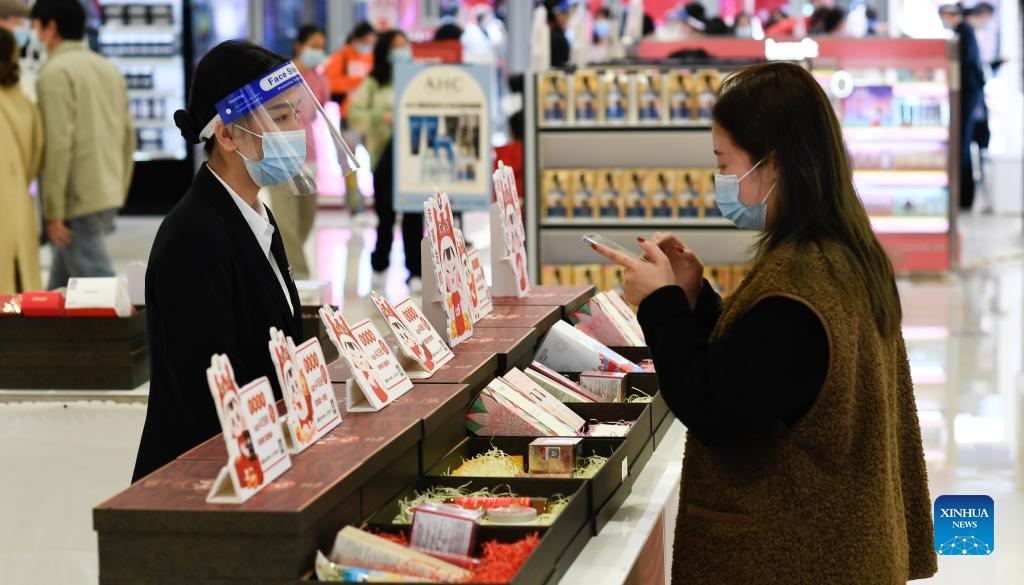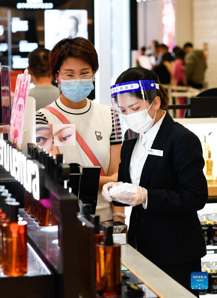 Customers select cosmetics in a duty-free shop in Haikou, capital of south China's Hainan Province, Feb. 3, 2022. (Xinhua/Yang Guanyu)