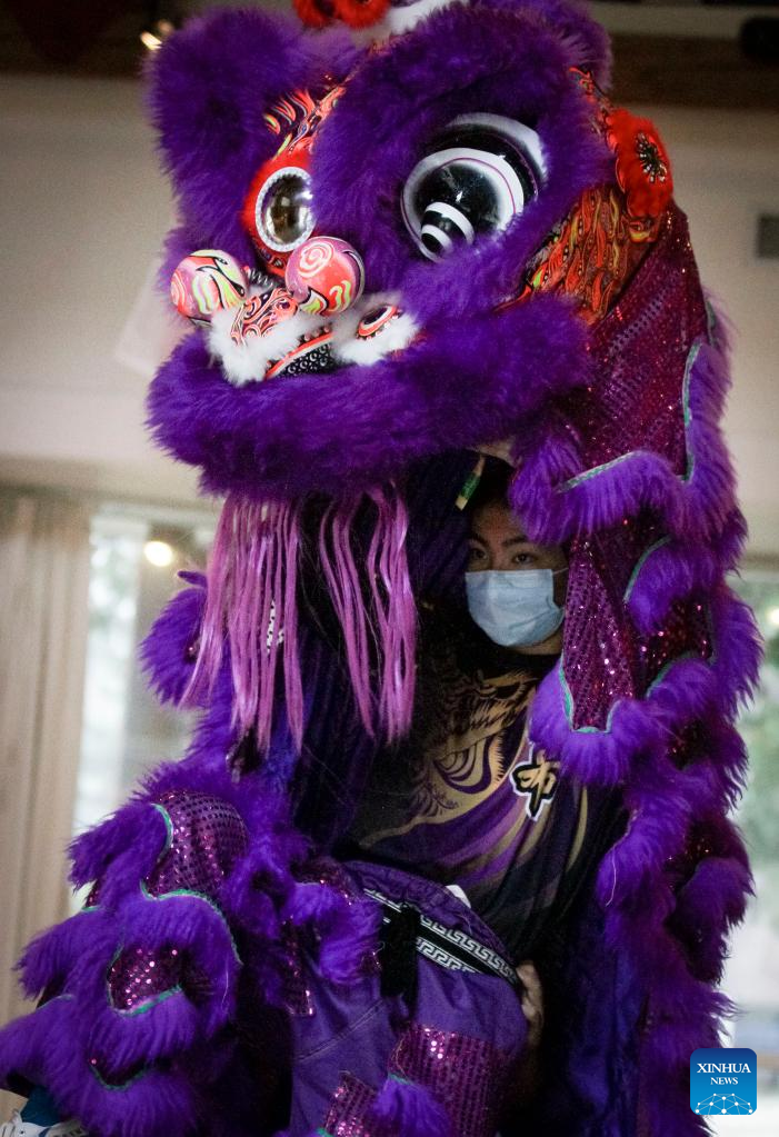 Lion dance performers demonstrate in front of a camera during an event at St. John's College, the University of British Columbia, in Vancouver, British Columbia, Canada, on Feb. 3, 2022. A lion dance was performed here on Thursday for people who may watch online or from outside through the windows, marking the Chinese New Year amid the COVID-19 pandemic. (Photo by Liang Sen/Xinhua)