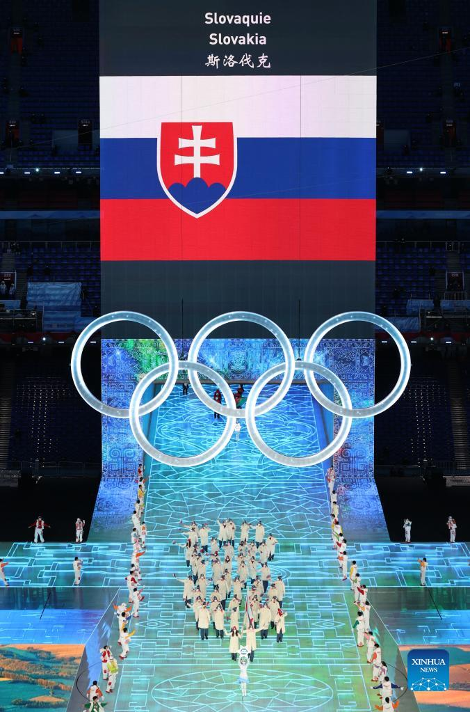 The Olympic delegation of Slovakia parade into the National Stadium during the opening ceremony of the Beijing 2022 Olympic Winter Games in Beijing, capital of China, Feb. 4, 2022. (Xinhua/Yang Lei)