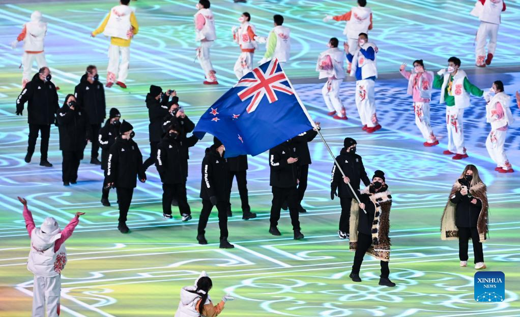 The Olympic delegation of New Zealand parade into the National Stadium during the opening ceremony of the Beijing 2022 Olympic Winter Games in Beijing, capital of China, Feb. 4, 2022. (Xinhua/Li Ziheng)