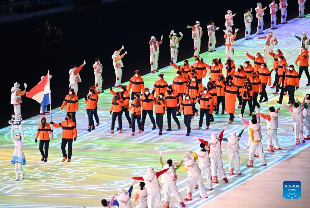 The Olympic delegation of Netherlands parade into the National Stadium during the opening ceremony of the Beijing 2022 Olympic Winter Games in Beijing, capital of China, Feb. 4, 2022. (Xinhua/Huang Zongzhi)