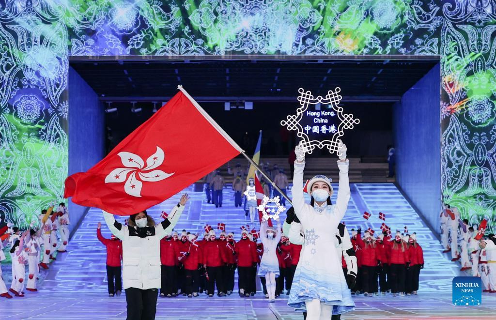 The Olympic delegation of Hong Kong, China (front) parade into the National Stadium during the opening ceremony of the Beijing 2022 Olympic Winter Games in Beijing, capital of China, Feb. 4, 2022. (Xinhua/Cao Can)