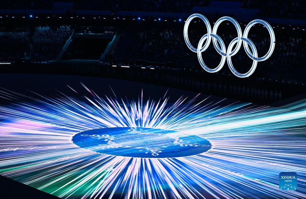 Photo taken on Feb. 4, 2022 shows the Olympic Rings in ice and the LED floor image of the large snowflake framed by calligraphic "olive branches", which symbolizes all people living in peace and harmony, during the opening ceremony of the Beijing 2022 Olympic Winter Games at the National Stadium in Beijing, capital of China. (Xinhua/Wang Fei)