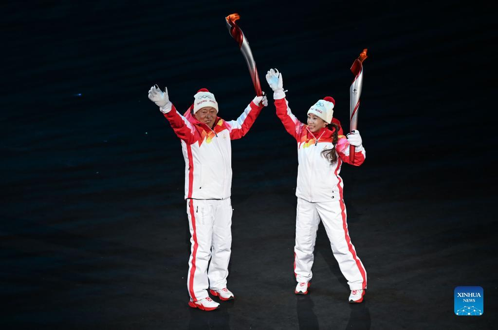 Torch bearers Zhao Weichang (L) and Li Yan gesture during the opening ceremony of the Beijing 2022 Olympic Winter Games at the National Stadium in Beijing, capital of China, Feb. 4, 2022. (Xinhua/Xiong Qi)