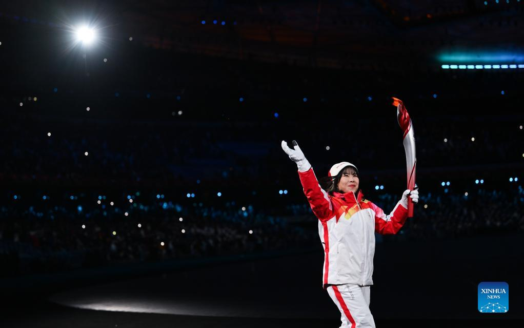 Torch bearer Zhou Yang runs with the Olympic torch during the opening ceremony of the Beijing 2022 Olympic Winter Games at the National Stadium in Beijing, capital of China, Feb. 4, 2022. (Xinhua/Ju Huanzong)