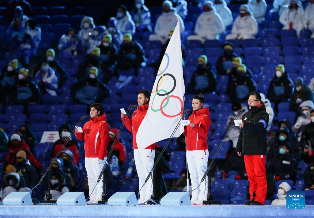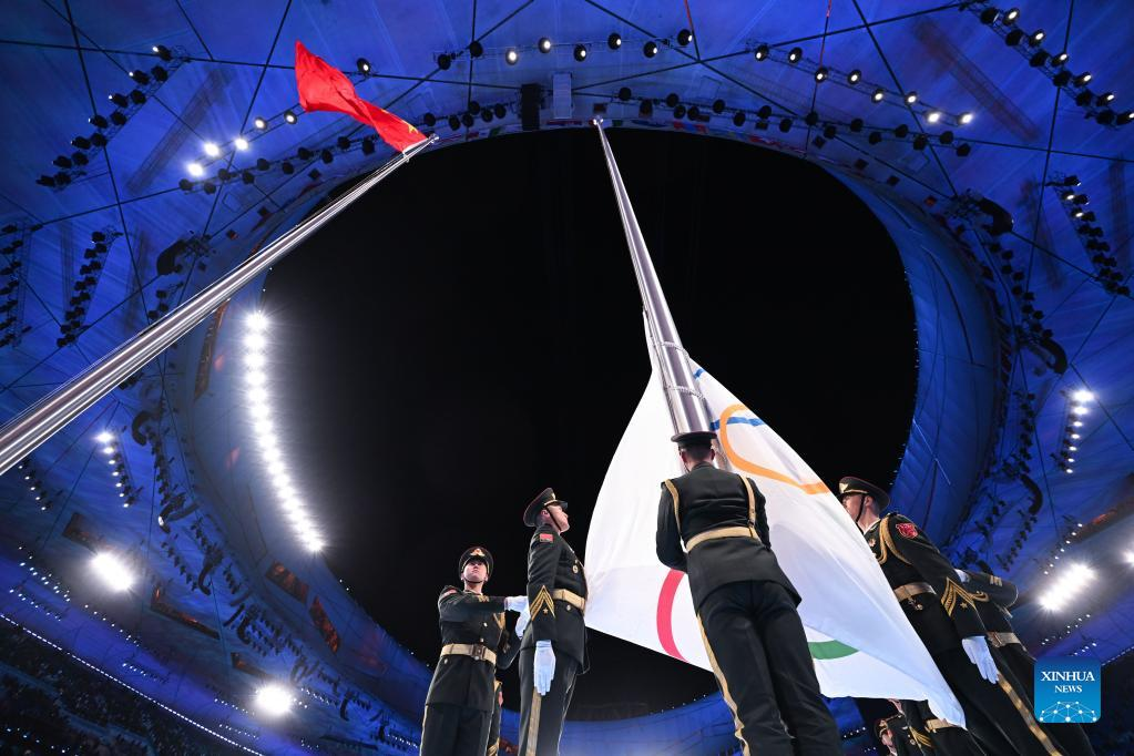 The Olympic flag is raised during the opening ceremony of the Beijing 2022 Olympic Winter Games at the National Stadium in Beijing, capital of China, Feb. 4, 2022. (Xinhua/Ju Huanzong)