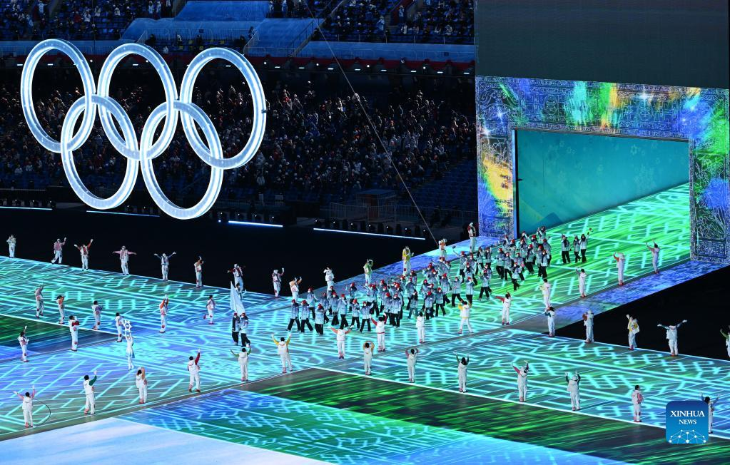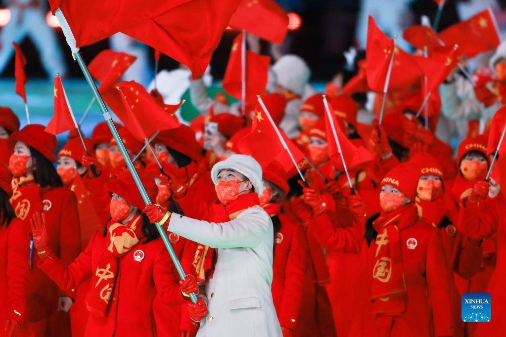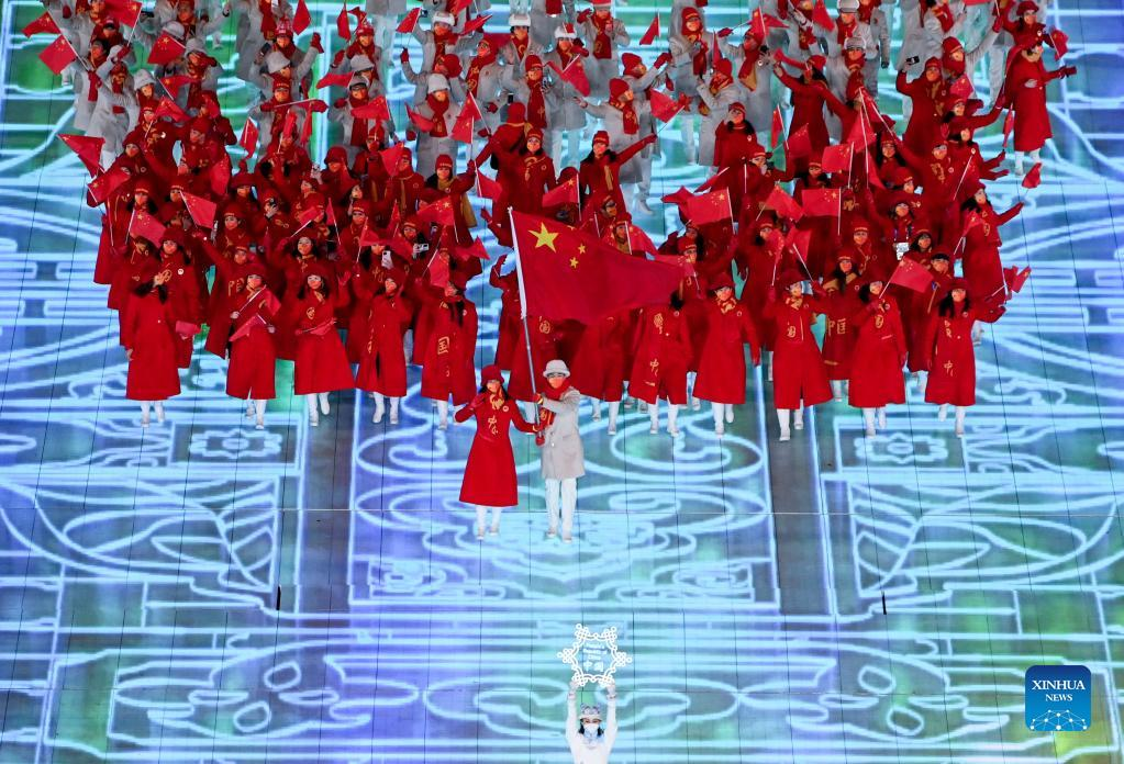 The Olympic delegation of the People's Republic of China parade into the National Stadium during the opening ceremony of the Beijing 2022 Olympic Winter Games in Beijing, capital of China, Feb. 4, 2022. (Xinhua/Cao Can)