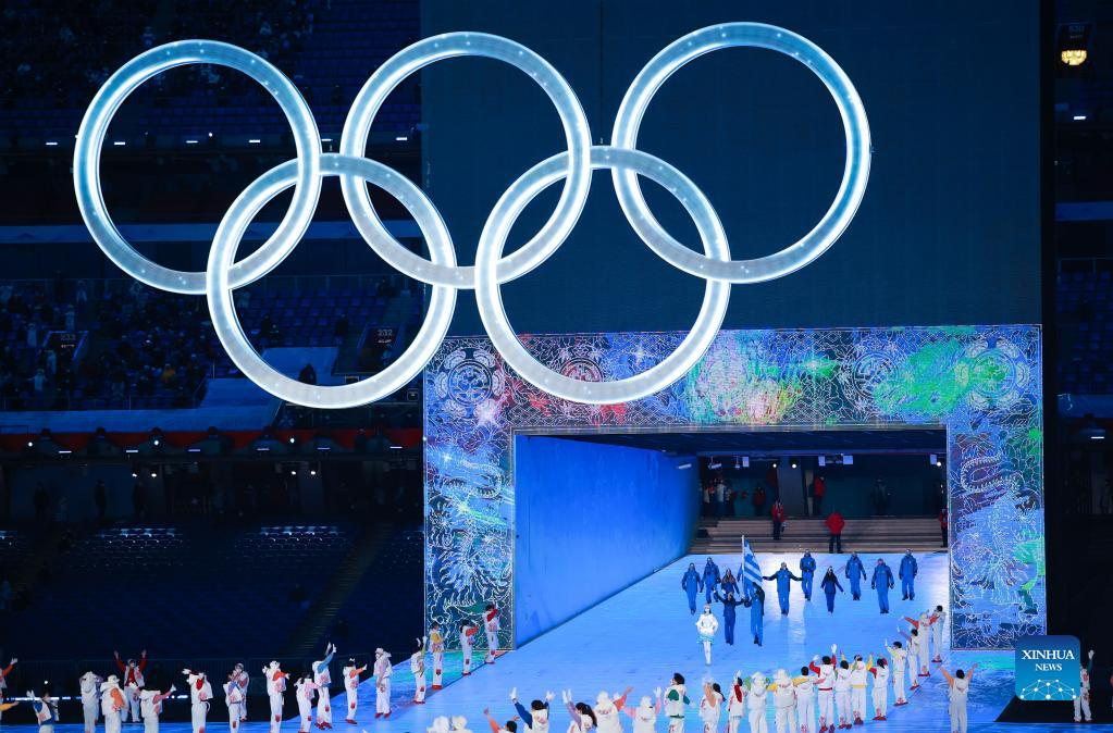 The Olympic delegation of Greece parade into the National Stadium during the opening ceremony of the Beijing 2022 Olympic Winter Games in Beijing, capital of China, Feb. 4, 2022. (Xinhua/Liu Xu)