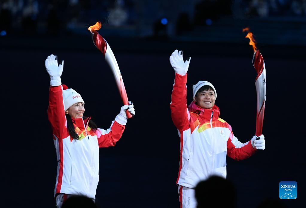 Torch bearers Yang Yang (L) and Su Bingtian attend the opening ceremony of the Beijing 2022 Olympic Winter Games at the National Stadium in Beijing, capital of China, Feb. 4, 2022. (Xinhua/Li Ga)