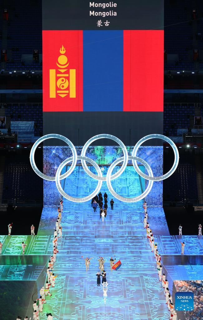 The Olympic delegation of Mongolia parade into the National Stadium during the opening ceremony of the Beijing 2022 Olympic Winter Games in Beijing, capital of China, Feb. 4, 2022. (Xinhua/Yang Lei)