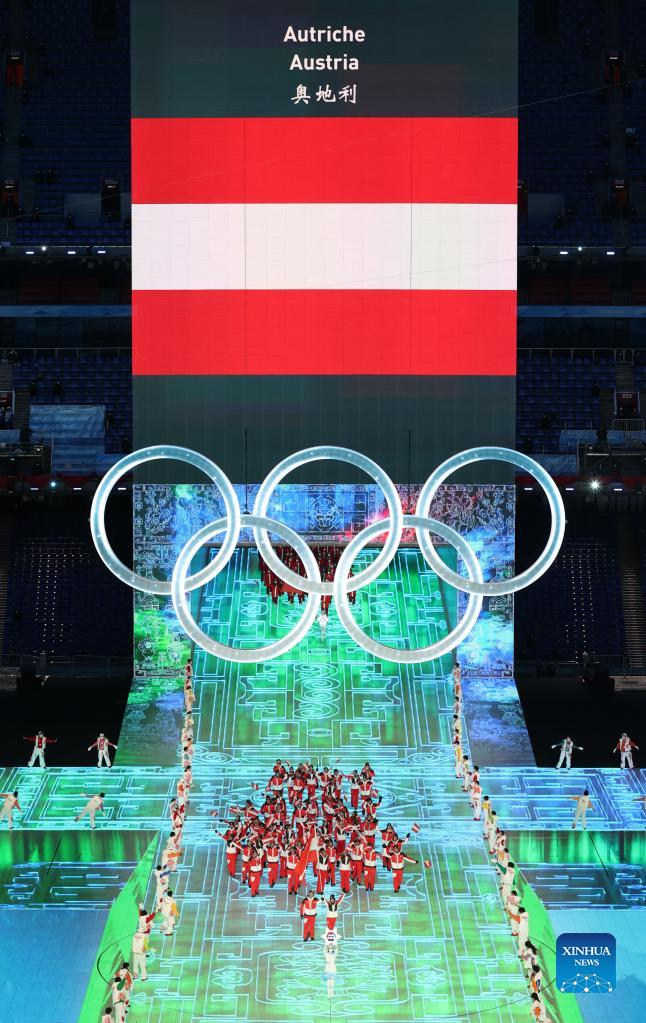 The Olympic delegation of Austria parade into the National Stadium during the opening ceremony of the Beijing 2022 Olympic Winter Games in Beijing, capital of China, Feb. 4, 2022. (Xinhua/Yang Lei)