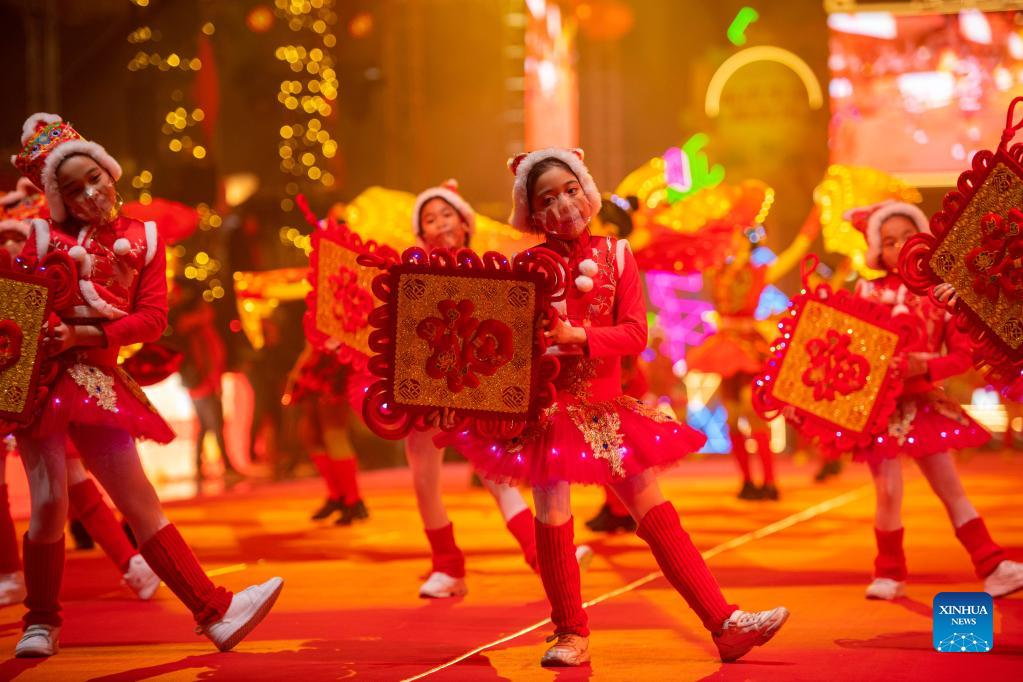 Children perform during a parade to celebrate Chinese Lunar New Year in south China's Macao on Feb. 3, 2022. (Xinhua/Cheong Kam Ka)