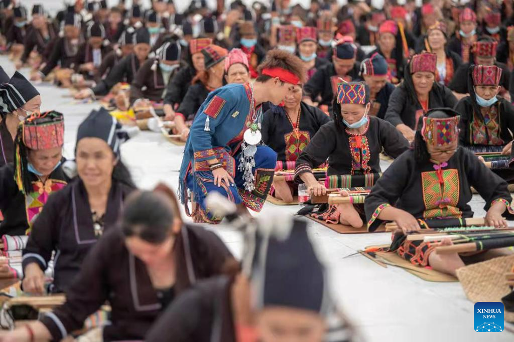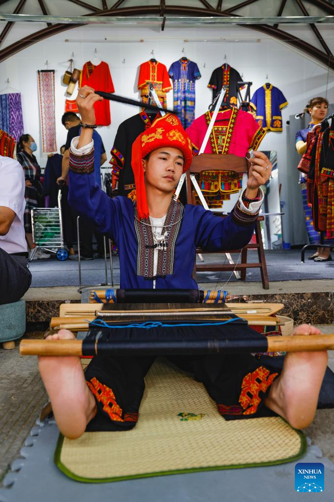 File photo shows Huang Yangwei, a 24-year-old man of the Li ethnic minority, weaves the Li ethnic brocade, in south China's Hainan Province, on Nov. 27, 2021. (Xinhua)